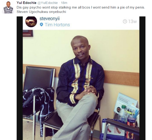The actor tweeted: “Dis gay psycho wont stop stalking me all bcos I wont send him a pix of my penis. Steven Ugochukwu onyebuchi. Is it by force to be gay? I hav no issues wit anyone being gay, it’s not my bizness but tryin to force someone else.”