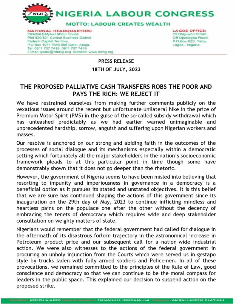 The labour body also expressed dismay at a government that imposed hardship on the people within a short period of assuming office, yet offered a meager sum to the poorest households while allocating substantial amounts to the rich in public office. The NLC questioned the fairness of the distribution and called for greater transparency in allocating the funds.