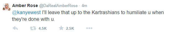 About Rose’s tirade against the Kardashians, Yeezy said “She’s just soaking in the moment, if Kim had dated me when I wanted, there would be no Amber Rose.”