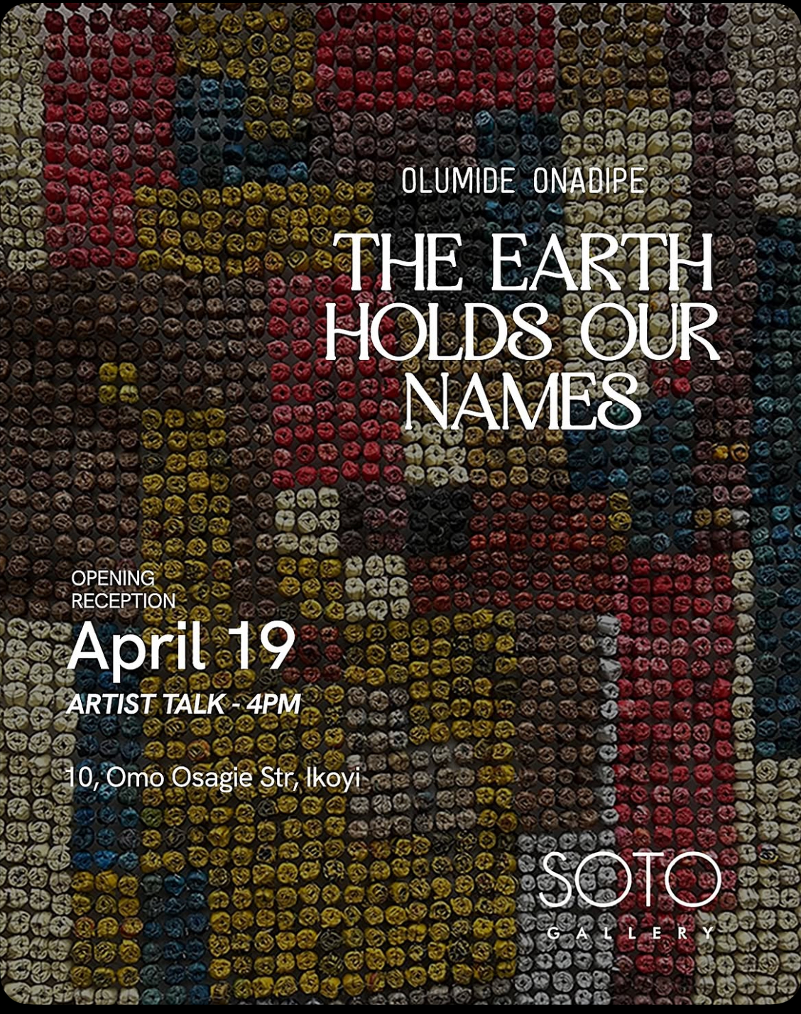 Hosted by the Soto Art Gallery, this solo exhibition by Olumide Onadipe is on the 19th of April and reflects on time and the earth through a Yoruba worldview.