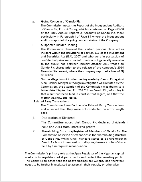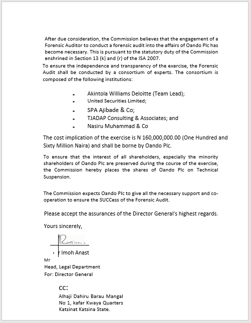 In the letter written by its head, Legal department, Braimoh Anastasia, SEC concluded that the findings are weighty and must be further investigated. The commission selected a consortium of experts to audit the company in order to ascertain the extent of the breaches. The cost of this audit is N160 million, which is to be borne by Oando Nigeria Plc.