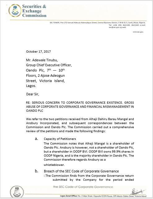 In the letter from SEC dated October 17, 2017, the commission said Alhaji Mangal is a shareholder. It added that Ansbury is not a shareholder of Oando Plc but a shareholder in OODP BVI, which owns 99.9% shares in OODP NIgeria, a majority shareholder in Oando Plc.