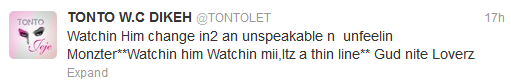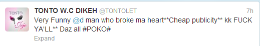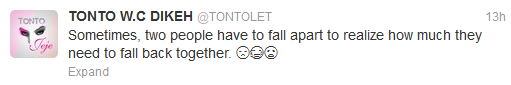What brought about a break-up rumour are the tweets below from Tonto’s handle: