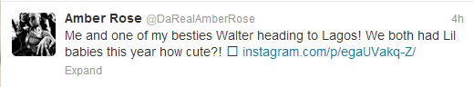 She will be joining Genevieve Nnaji, Boris Kodjoe, Kelechi Amadi-Obi and Karly Redd in judging the contestants at the Oriental hotel, Lagos, tomorrow September 22, 2013.The excited Amber Rose tweeted about it on her timeline.