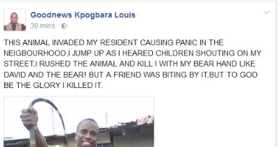 He further likened his feat to that of David and the bear in the Holy Bible as seen on his Facebook page.