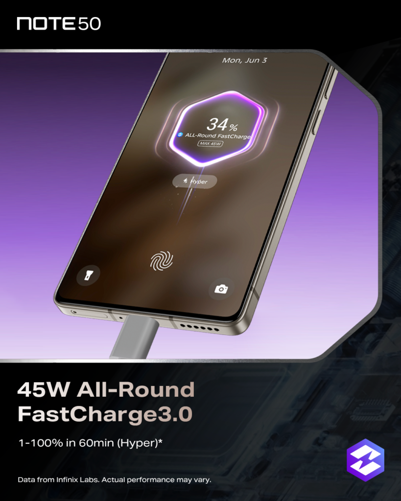 Today’s smartphones are part of our personal style, and the Infinix NOTE 50 is built to stand out. Its sleek, industrial design is crafted from a blend of Damascus steel and aerospace-grade aluminum, making it as durable as it is eye-catching. Whether you’re at work, at play, or showing off your latest fit, this phone holds its own in any setting.