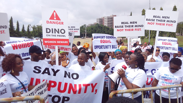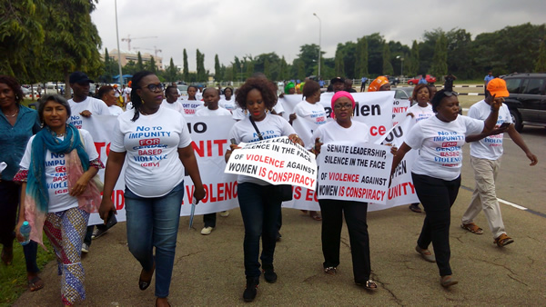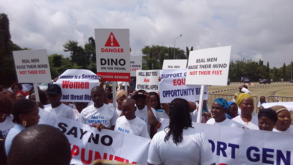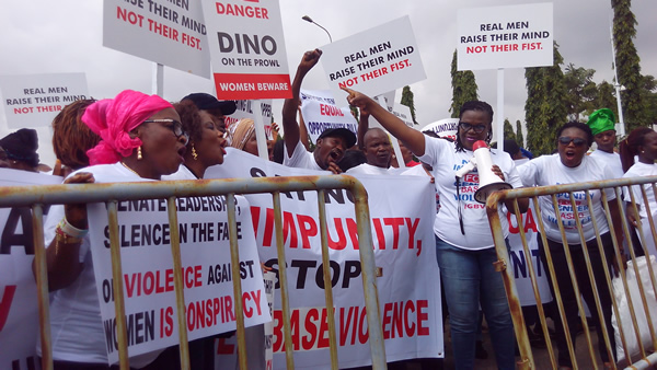 Some women are presently protesting against Senator Dino Melaye over alleged ‘assault’ of Senator Remi Tinubu.