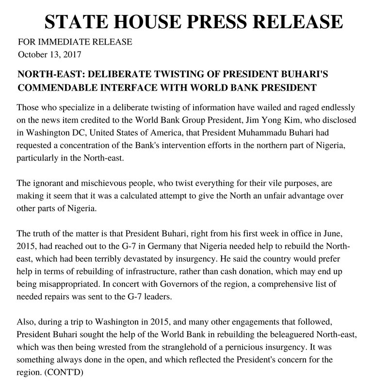 It also states that “Northeast Nigeria has always been a priority for President Buhari, right from when he campaigned to be President.”