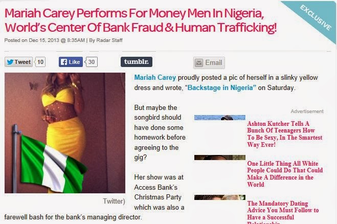 Ironically — given that she was performing for bankers — it seems Carey wasn’t aware Nigeria is well-known as the center of the world’s email financial crimes! Nigeria is even part of the name — as in “Nigerian 411 Scams.”