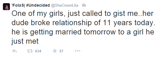 Nigerian Twitter literally erupted last night when writer cum blogger, @SheCrownLita broke the news that a friend of hers recently got dumped by her long time boyfriend.