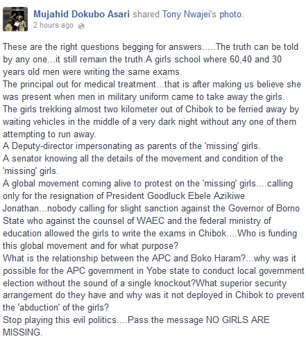 Former Niger Delta militant, Mujahid Asari-Dokubo has said that all news relating to the abduction of over 200 girls from Chibok in Borno is false.