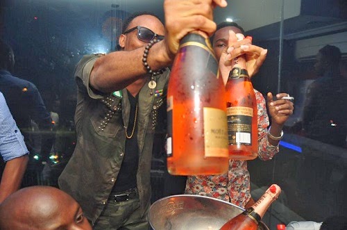 Peeshaun of the music duo Skuki turned 27 yesterday, he was said to have hosted some friends at his home during the day and at night headed to a club called D’place in Lekki for his party where he popped 27 bottles of the Rozay champagne and fireworks signifying his 27 years on earth.