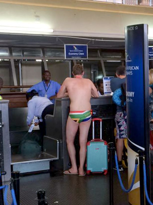 Seeing the funny side, instead of lending him some clothes his team mates dared him to fly home in his tiny speedos instead.