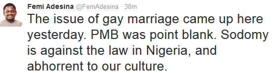 President Buhari rejected gay marriage during one of his discussions in the US yesterday. His media spokesperson, Femi Adesina made the announcement on Twitter this afternoon.