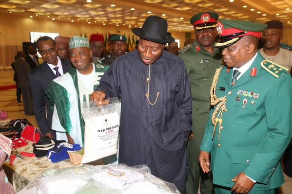 by Kemisola Filani President Goodluck Jonathan earlier today presented medals & certificates to deserving graduates at the NYSC Honours Awards. The occasion which took place at Aso Rock Presidential Villa in Abuja saw President Jonathan conduct an inspection of NYSC farm products and more. See photos below:
