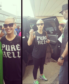 Amber Rose who is married to American rapper, Wiz Khalifa, arrived Nigeria wearing a black top with the curious inscription, ‘Pure Hell’, we hope she’s just referring to the heat and not what she’s heard about the country.