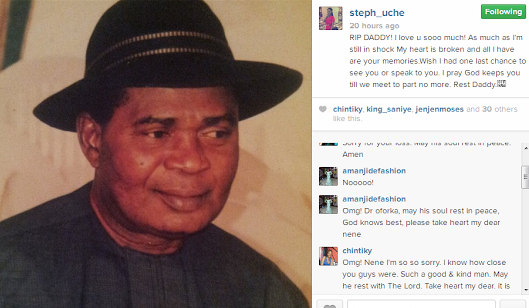Ex-beauty queen, Stephanie Oforka-Uche has lost her lecturer father to the cold hands of death.