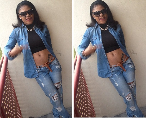 Doing the double denim trend pretty well, check out Big Brother Africa winner, Karen Igho showing off her midriff and her star tattoos.
