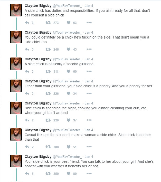 The conversation on side chicks will never grow old. This tweep brings a different perspective to the term ‘side chicks’, says they are honourable and help the main relationship prosper.