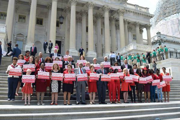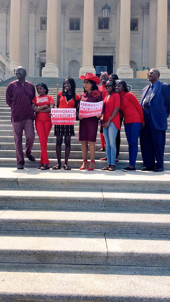 The members of Congress, led by Representative Frederica Wilson, wore red items of clothing in solidarity with the girls who are still missing.